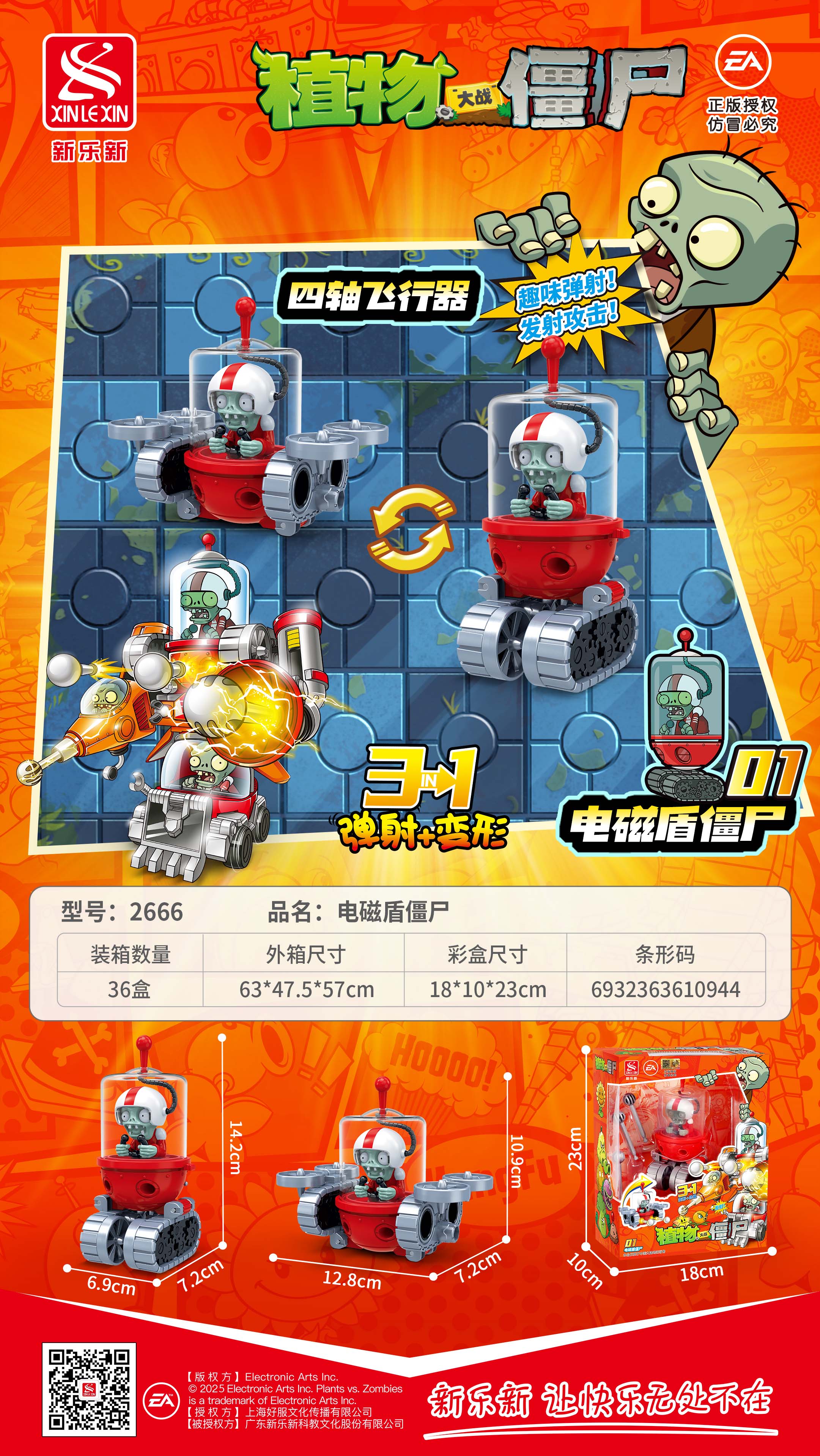 產品規(guī)格:電磁盾僵尸:6.9*7.2*14.2cm,四軸飛行器:12.8*7.2*10.9